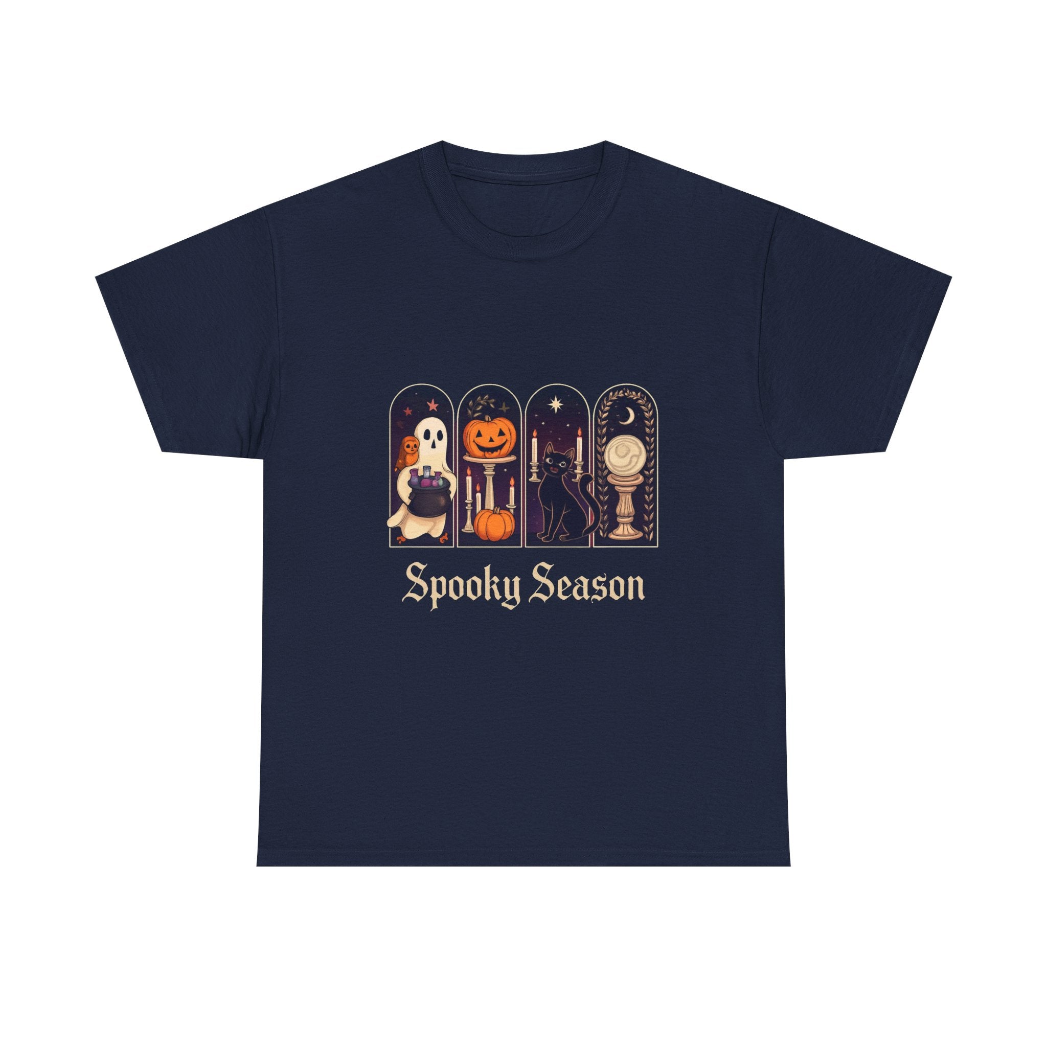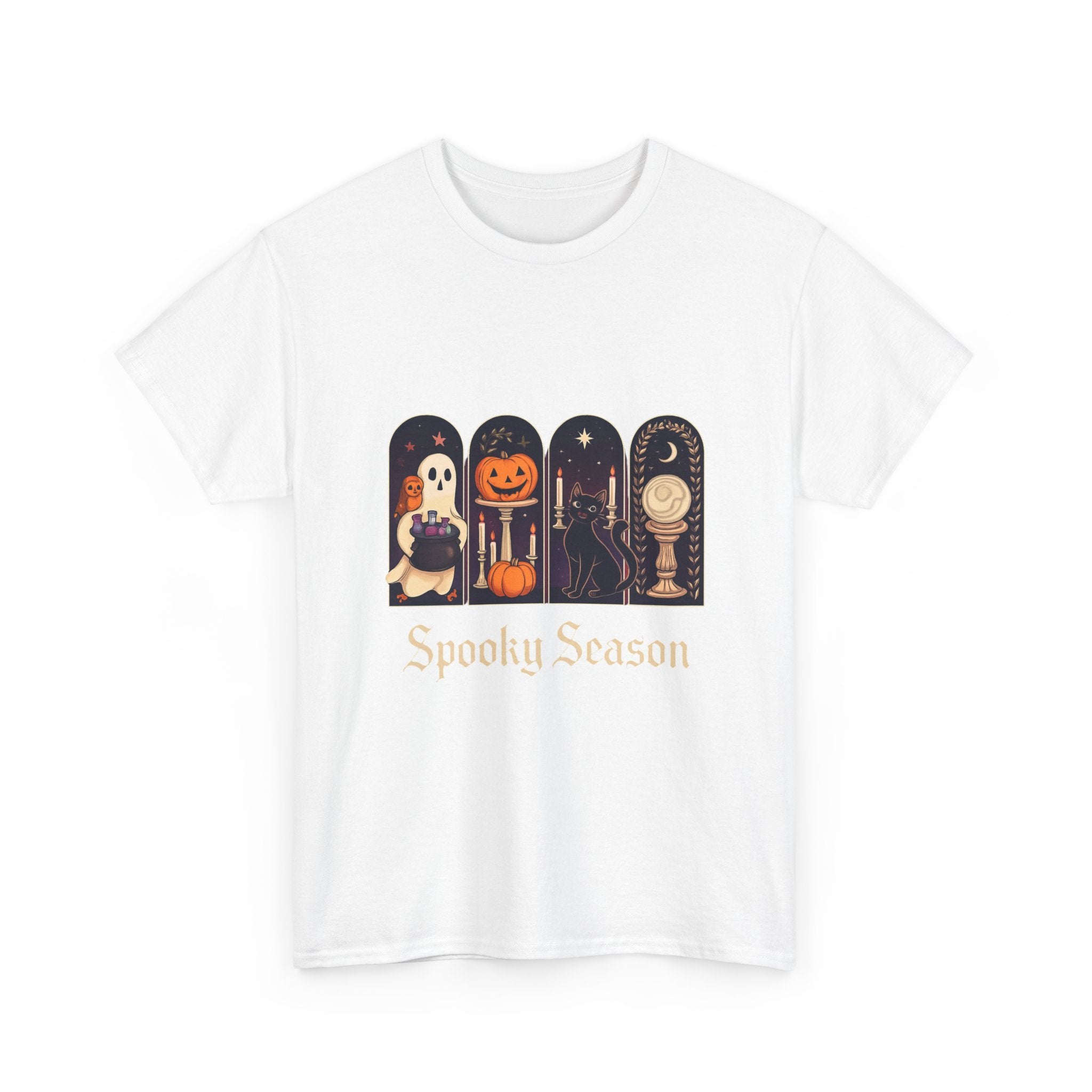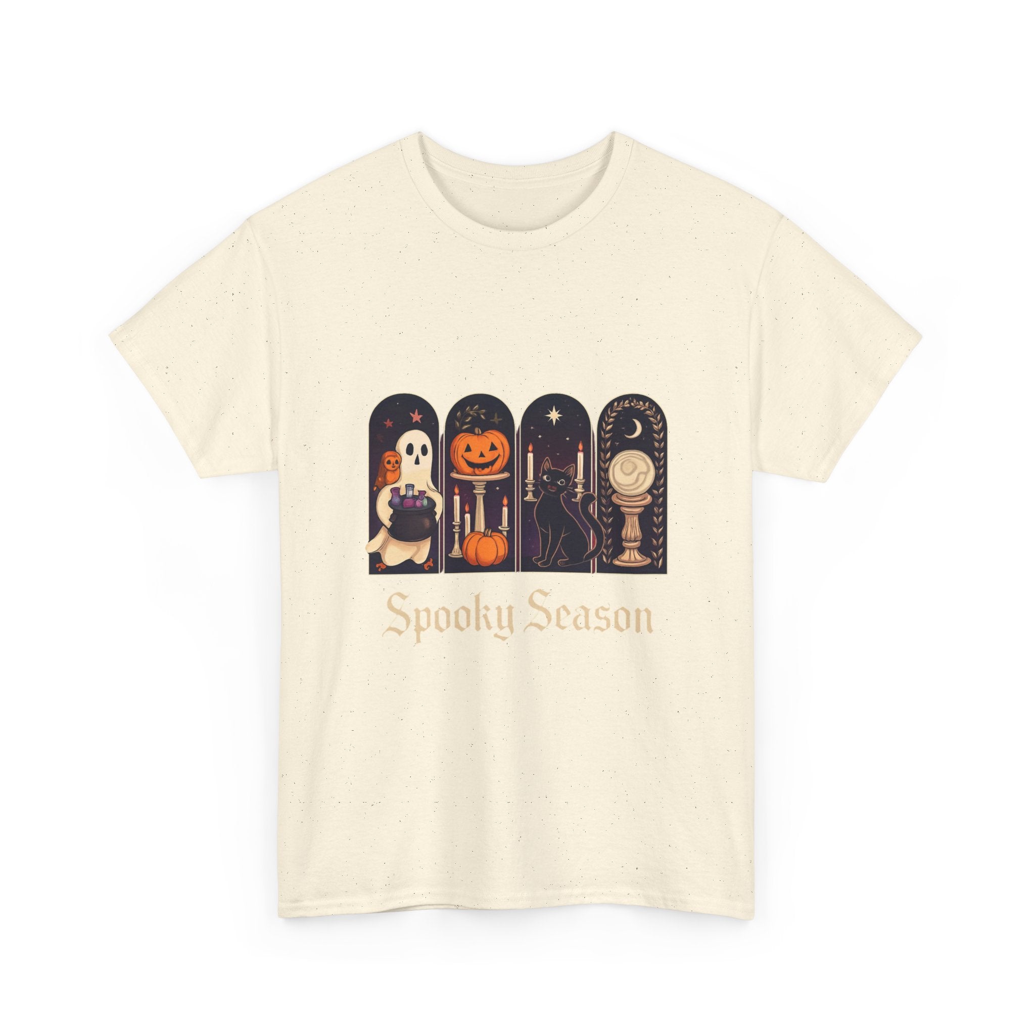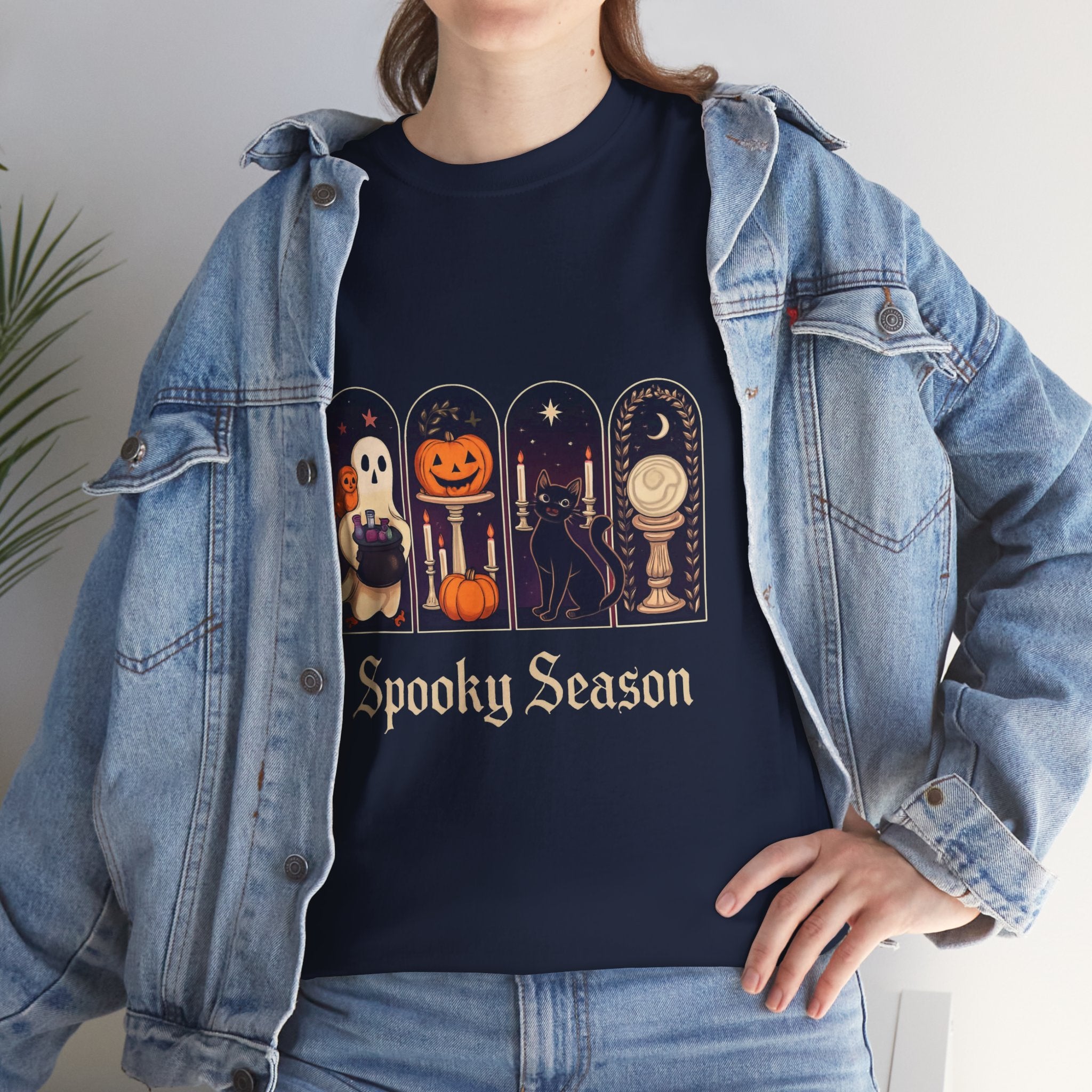 Introducing this Unisex Heavy Cotton Tee, designed for comfort and style. Made from high-quality cotton, it offers a soft and smooth feel against your skin, making it perfect for all-day wear. The classic crew neckline and relaxed fit provide a versatile look, allowing it to easily transition from casual outings to semi-formal gatherings. The tee's unique 'Spooky Season' design adds a playful vibe, ideal for Halloween enthusiasts or anyone looking to celebrate the fall festivities. It's a perfect gift for friends and family during Halloween parties, autumn events, or cozy movie nights. Embrace the seasonal spirit while prioritizing comfort and sustainability with this stylish tee!
