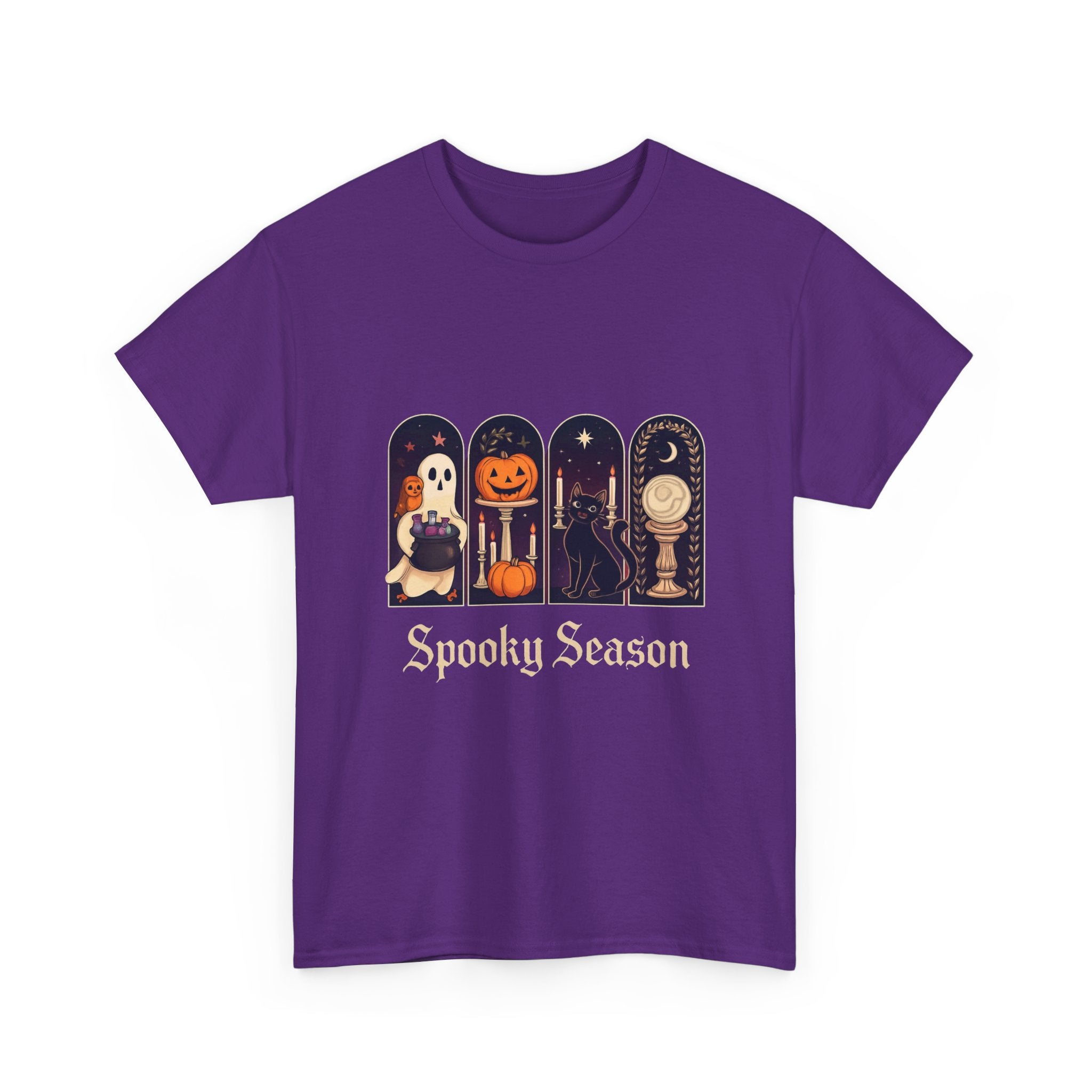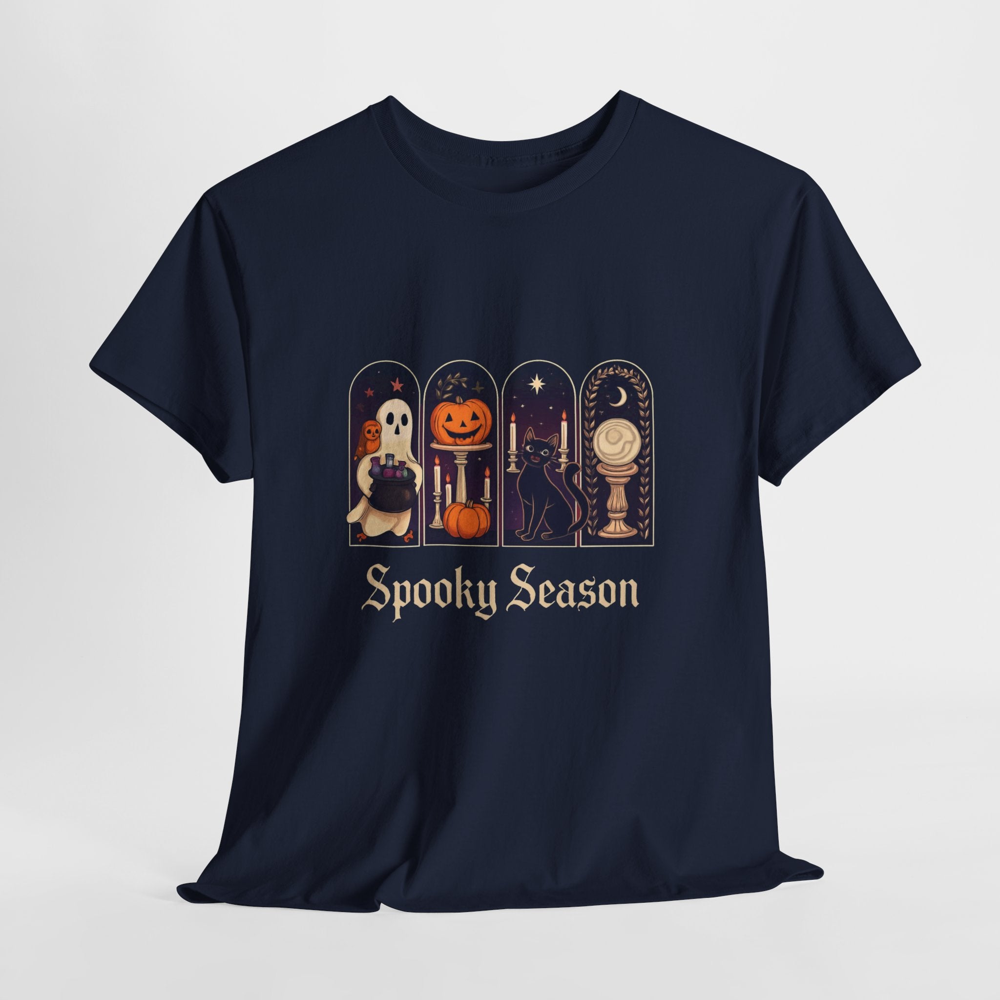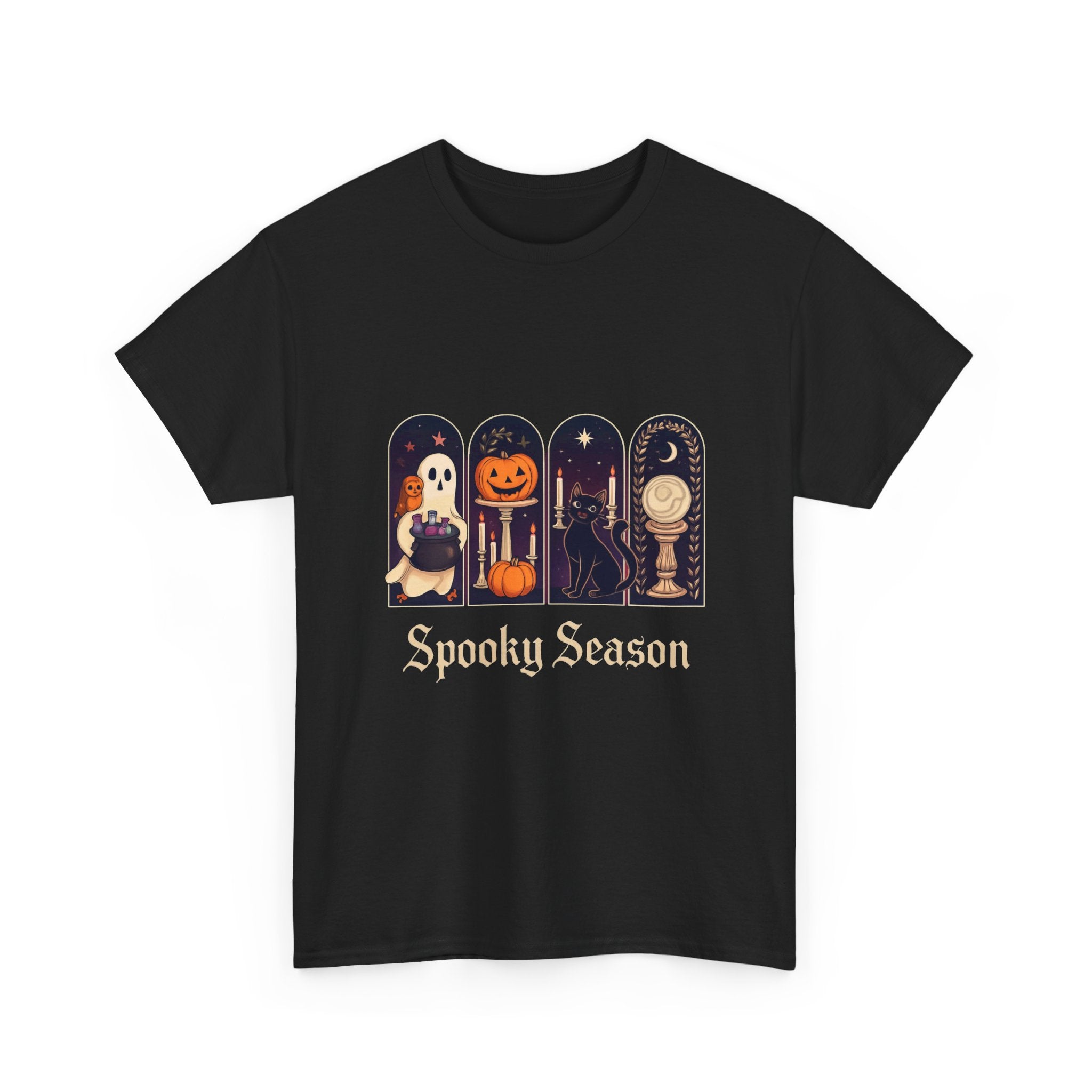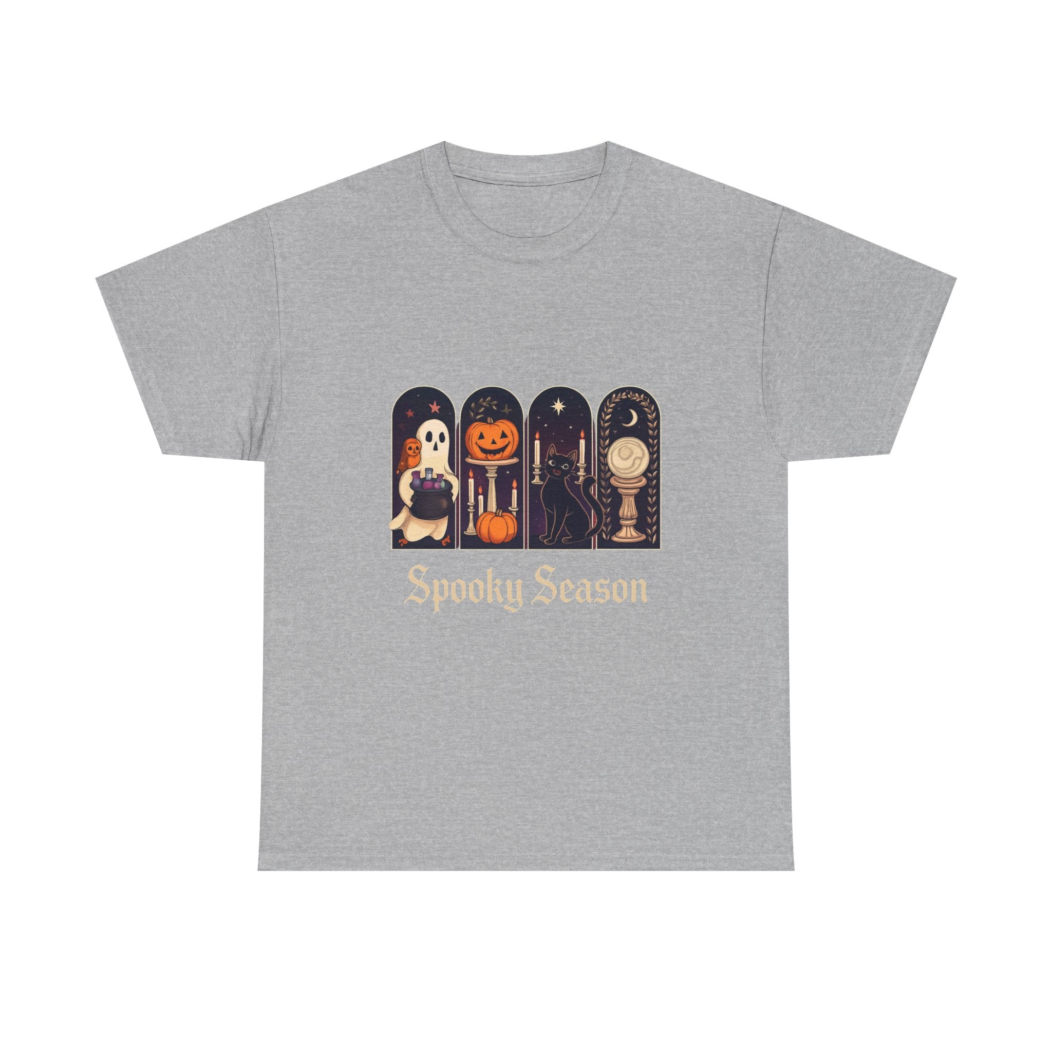 Introducing this Unisex Heavy Cotton Tee, designed for comfort and style. Made from high-quality cotton, it offers a soft and smooth feel against your skin, making it perfect for all-day wear. The classic crew neckline and relaxed fit provide a versatile look, allowing it to easily transition from casual outings to semi-formal gatherings. The tee's unique 'Spooky Season' design adds a playful vibe, ideal for Halloween enthusiasts or anyone looking to celebrate the fall festivities. It's a perfect gift for friends and family during Halloween parties, autumn events, or cozy movie nights. Embrace the seasonal spirit while prioritizing comfort and sustainability with this stylish tee!